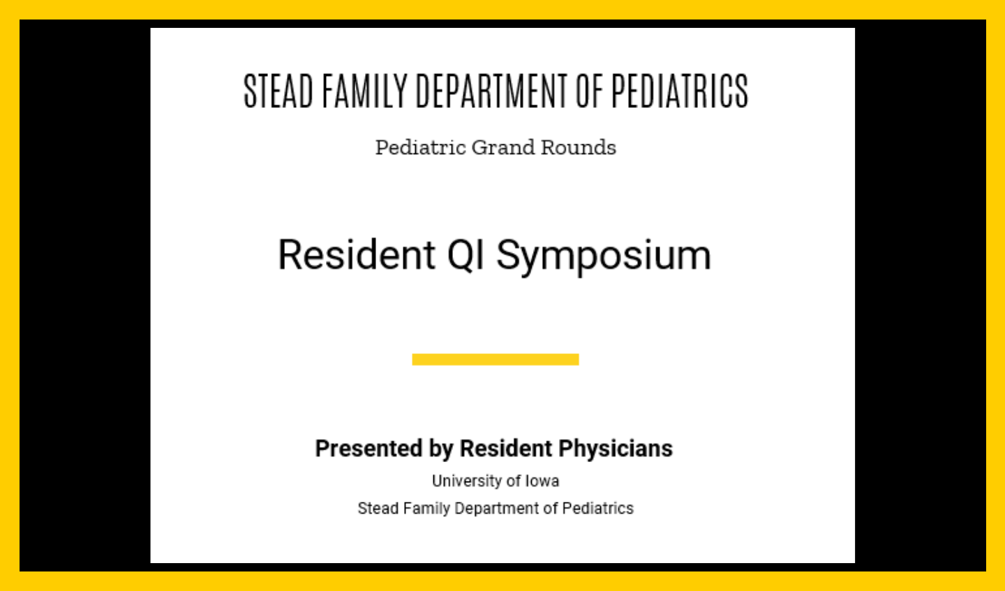 | | | Save the Date! Pediatric Resident QI Symposium The Pediatric Resident QI Symposium features presentations of resident QI projects and a poster session. Faculty and trainees are encouraged to attend to listen to the great improvement work done by our residents. This symposium will be presented in conjunction with Pediatric Grand Rounds.