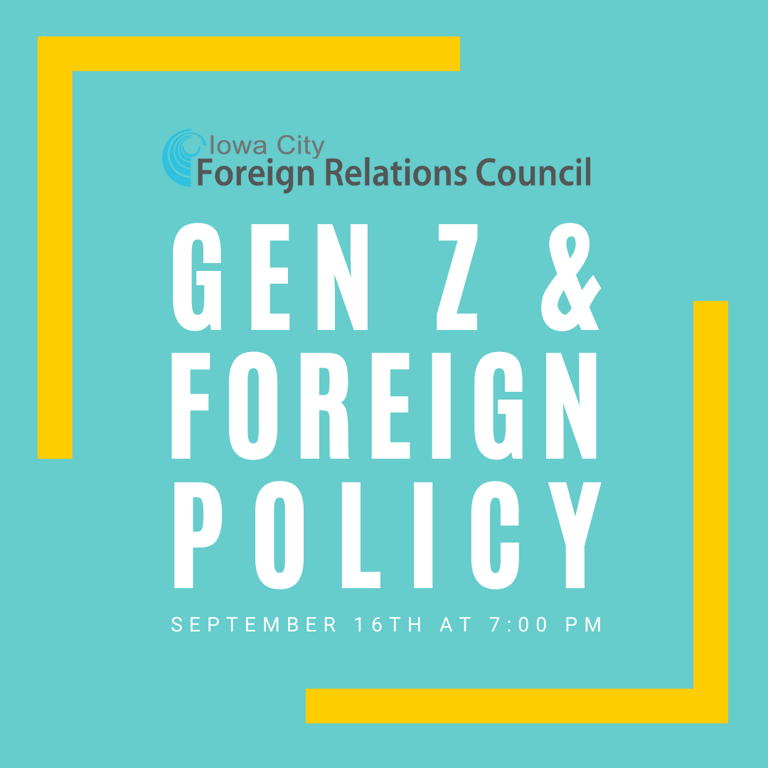 Are you interested in learning more about Gen Z and foreign policy? Join the ICFRC on Thursday, September 16th at 7pm at the Old Capitol Building in the Old Senate Chamber to hear from professionals and students about their experience with foreign policy! Dr. Brian Lai, Dr. Mike Hais, Amelia Thoreson, and Carolina Herrera will discuss how Gen Z differs from previous generations regarding their views on international issues and American foreign policy and how those differences will shape public policy in the future.