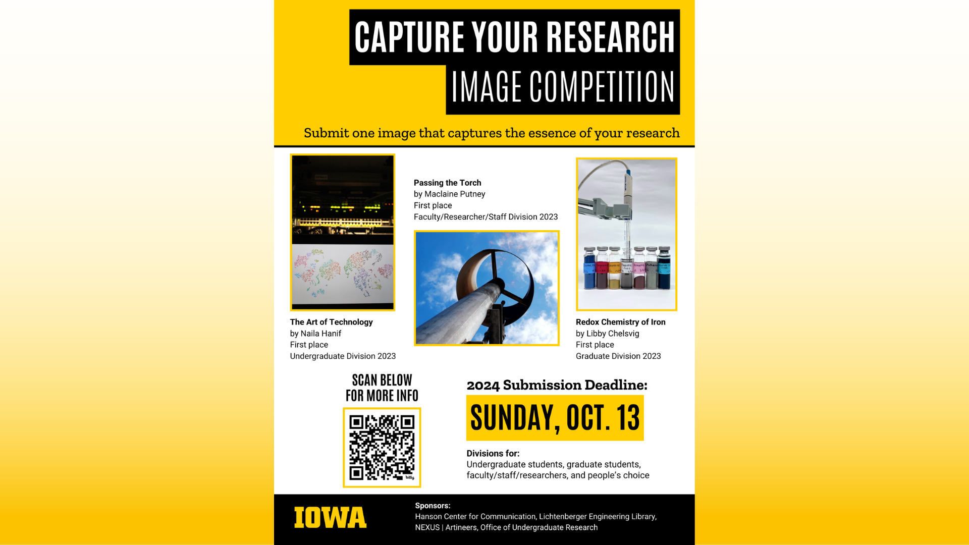 The top 25 entries will be displayed at our Capture Your Research Reception and Awards Ceremony. The awards will be presented at an awards ceremony at the Old Capitol Museum on Tuesday, Nov. 12, at 4 p.m.