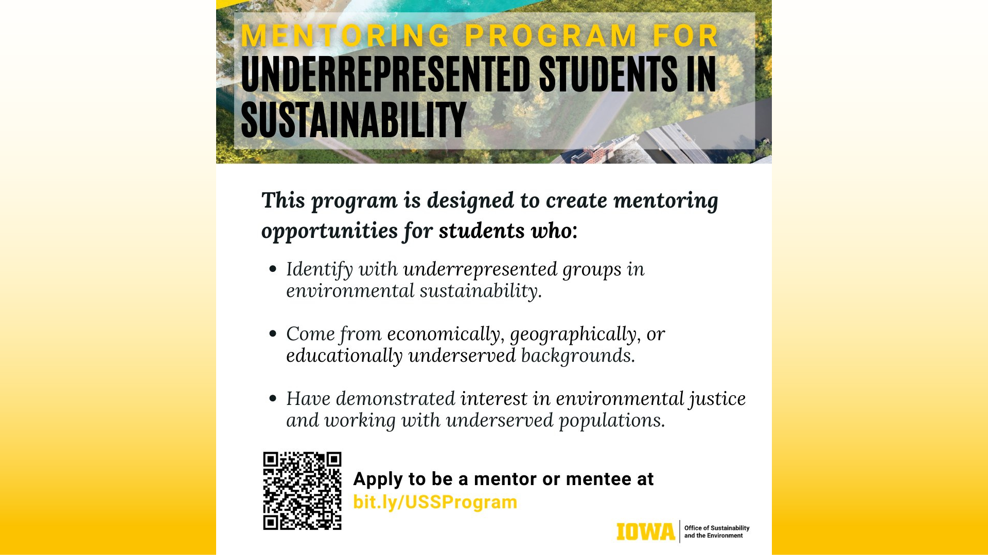 Click here for more information | | | Underrepresented Students in Sustainability With fall semester underway, the Office of Sustainability is kicking off their 4th year of the Underrepresented Students in Sustainability (USS) Mentoring Program. This program is designed to make mentoring opportunities more accessible to undergraduates from underrepresented backgrounds who are exploring careers in sustainability and the environment.