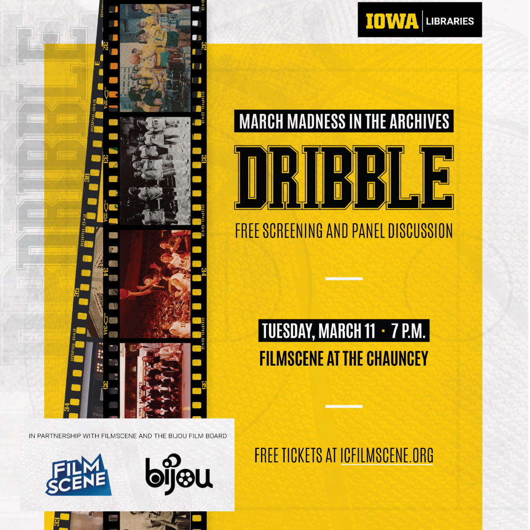 This March Madness season, celebrate basketball history with the Iowa Women’s Archives (IWA)! In partnership with FilmScene and the Bijou Film Board, join us for clips from the 1979 film Dribble (also known as Scoring), a women’s basketball comedy filmed in Cedar Rapids and featuring the Iowa Cornets, who played in the professional Women’s Basketball League from 1978–80. A panel discussion will follow, featuring Lark Birdsong, the first women’s basketball coach at Iowa; Dr. Shelley Lucas, a sports historian who has written about the Cornets; and Dr. Kären Mason, IWA’s first curator, whose work collecting our women’s basketball materials laid crucial groundwork for these stories to be told.